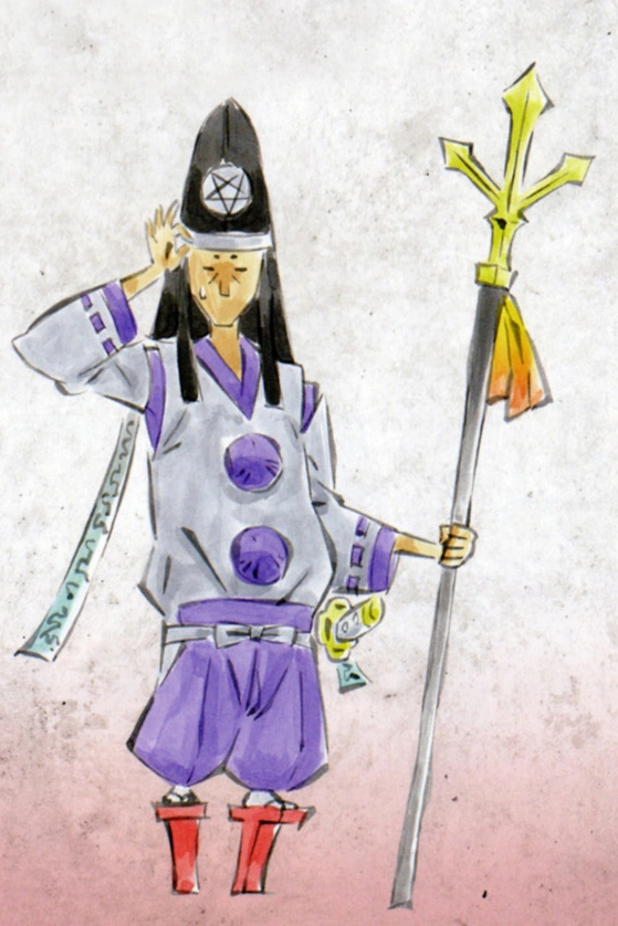 Abe wears the standard attire of the Tao Troopers. His shirt is an extremely pale shade of purple with bright purple trim and pompoms. His belt is the same pale shade of purple as his shirt, as are his socks. His bright purple pants match the trim of his shirt. Like Waka, Abe wears tall, red "platform" geta with a single tooth, though his aren't quite as tall as Waka's. Atop his head sits a large, black, conical hat with gray trim and two long ribbons that hang down his back. Abe has long black hair, round eyebrows and creases beneath his eyes. At his waist is his gold hilted sword and he carries a large trident. When Amaterasu first met Abe he had lost his mask but resumes wearing it once it has been returned to him.