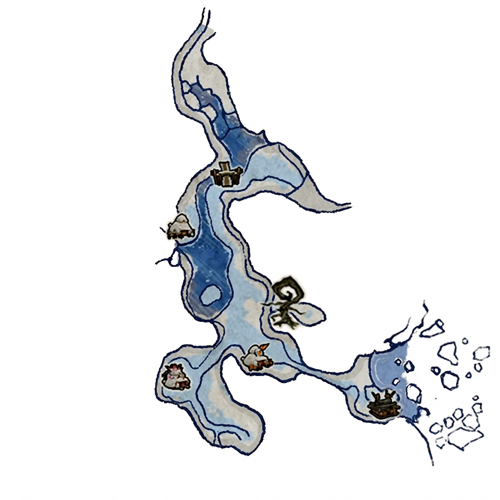 Kamui is a harsh landscape, blanketed in heavy, white snow nearly year-round. Many of the civilizations are hidden between the twin peaks of Ezofuji, at which the Twin Demons Lechku & Nechku are enshrined. The terrain itself is uneven, with snowy land flowing into icy pools where was once flowed freely, making it easy to lose proper footing, slipping and falling all over the place. The island also boasts a thick forest, Yoshpet, from which it is said escape is impossible. However, this is where the tiny Poncles make their home, in a tree stump called Ponc'tan found in an oddly warm and blossoming clearing. Other than this vast forest, the vegetation found throughout Kamui tends to be short and sparse, to due a lack of viable soil in which plants can grow, in addition to a lack of warmth and light to stimulate their growth.