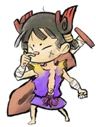 Kuni's final model ended up being a small boy who always carries his wooden sword on his back. He wears a one piece purple outfit which has a huge tear down the middle. He has a small red round nose, and small round eyebrows. He also has a bruise on one of his cheeks. His hair is tied into buns on each side of the back of his head which are styled to look like Chibiterasu's winglets.