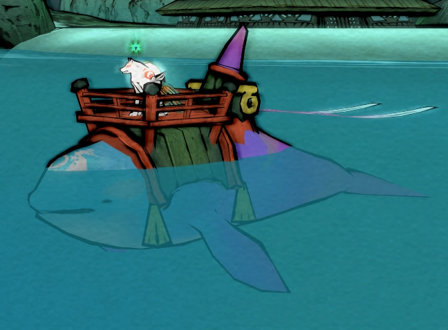 After speaking with Urashima, Amaterasu heads to the dock, where Urashima encountered Orca. She uses the Sunrise brush technique, which summons him. Orca arrives, looking quite excited to meet Amaterasu. He gladly offers his services to her, telling her that he will take her to the Dragon Palace. Urashima shows up, happy to see Orca again. He attempts to jump on Orca's back, who smacks him away instead.