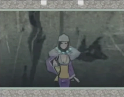 Real Rao's appearance as a ghost guiding Amaterasu to the hidden path behind Ankoku Temple. Note her blue necklace and different hairstyle.