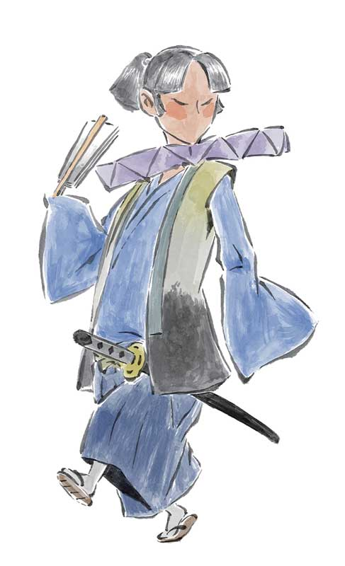 The samurai wears richly decorated robes with a yellow, black, and white vest completing the look. He has two white tabi with sandals. He has a large frill around his neck, like those worn by people in England during Elizabethan times, giving him a somewhat western appearance, thus being called "dandy". He has a long samurai sword and a small white fan. Also, he has pale skin, and a long, black ponytail.