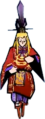 Sugawara is a politician of Sei'an City. He dresses accordingly to a politician's uniform, which consists of a deep-red coat, with intricate golden markings on it. These markings resemble clouds and an eye on the chest. A rectangular fabric is on the front of the robe, from the waist down to the knees, with purple markings on it. On the collar of the robe is a purple string, tied into a bow, for either adjusting the collar's width or decoration, or both. The robe itself consists of large sleeves, and when Sugawara puts his hands together, they are concealed within. Under the robe is a purple suit, which is seemingly lined with a purple hakama, along with some white markings on it. This gives Sugawara similarities to Waka's appearance. The similarities are furthered with his white socks and high, single-toothed Tengu geta. Sugawara also wears a politician's hat. Like all other members of the Moon Tribe, he has waist-length, flowing, golden hair, and two dots between his eyebrows.