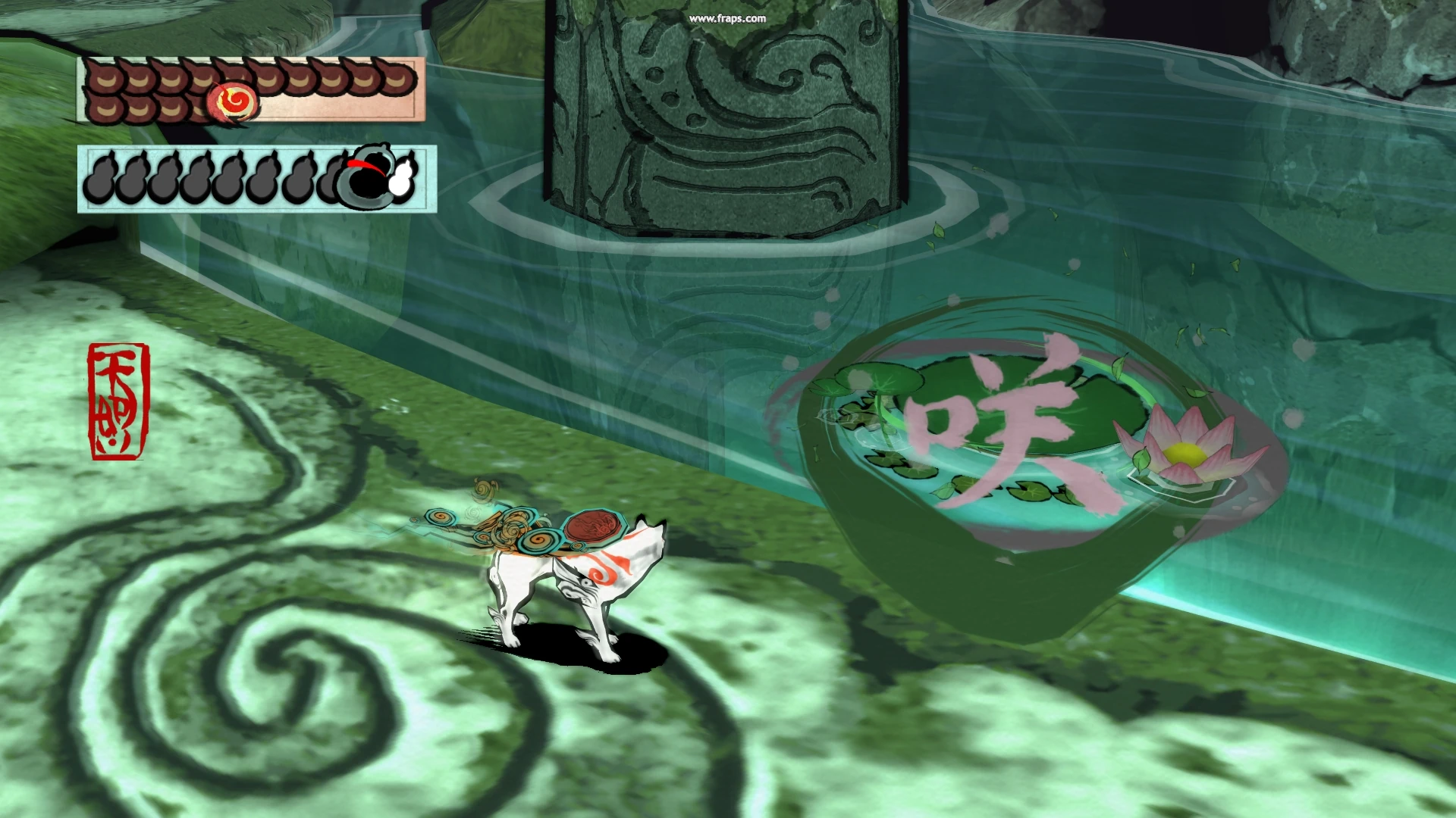 To use Water Lily, draw a fully enclosed circle on the water surface. This creates a lily pad that can be used as stepping stones for Amaterasu to catch her breath between swimming sessions if she ran out of air. Only three lily pads can exist at a time, and when the fourth is drawn, the first one disappears with a bit of sparkles, and so on. A lily pad can also disappear when it collides with another one, or when it is created on magma or poison.